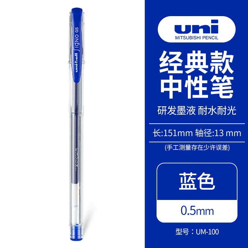 商品名称:三菱(Uni)UM-100学生中性笔签字笔 0.5mm双珠防漏墨啫喱笔考试经济型水笔(替芯UMR-5) 蓝色 单支装 单位:支