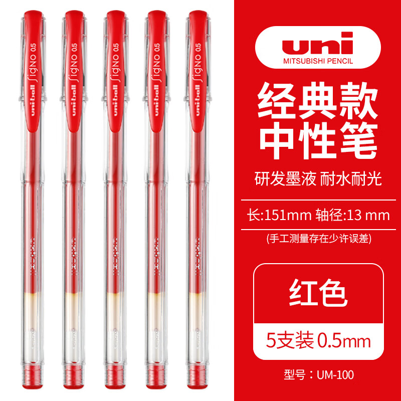 商品名称:三菱(Uni)UM-100学生用中性笔签字笔红色(替芯UMR-5)0.5mm 5支装 单位:盒