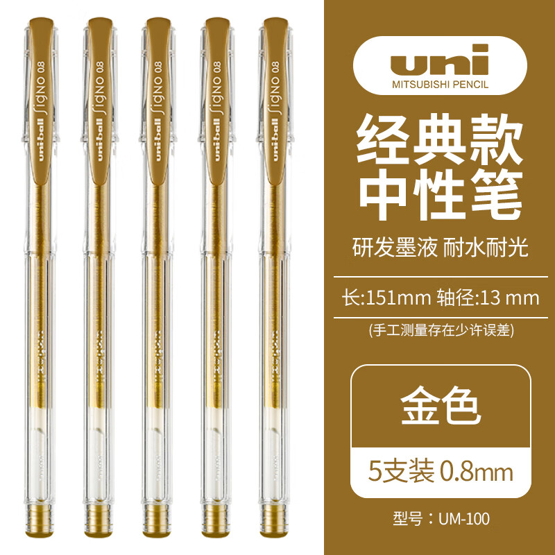 商品名称:三菱(Uni)UM-100 经济实用型中性笔抄经笔金色 0.8mm 5支装 单位:盒