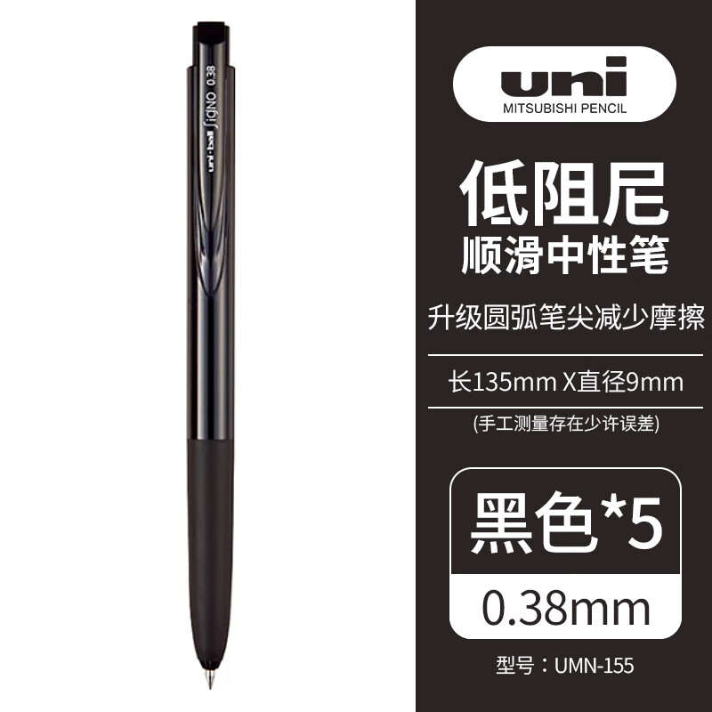 三菱(Uni)按动中性笔0.38mm财务办公考试笔UMN-155(替芯UMR-83)黑色5支装 单位:盒