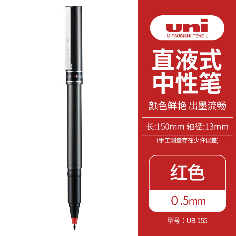 商品名称:三菱(Uni)UB-155中性笔走珠笔0.5mm学生考试用笔耐水耐晒办公签字笔 红色 1支装 单位:支