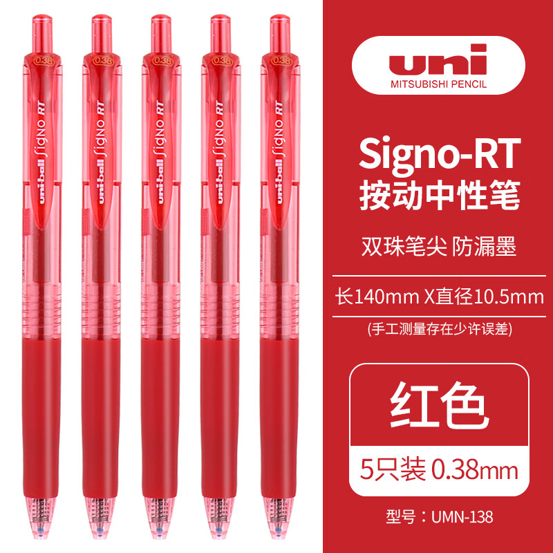 商品名称:三菱(Uni)UMN-138按动中性笔0.38mm财务办公考试笔(替芯UMR-83)红色5支装 单位:盒