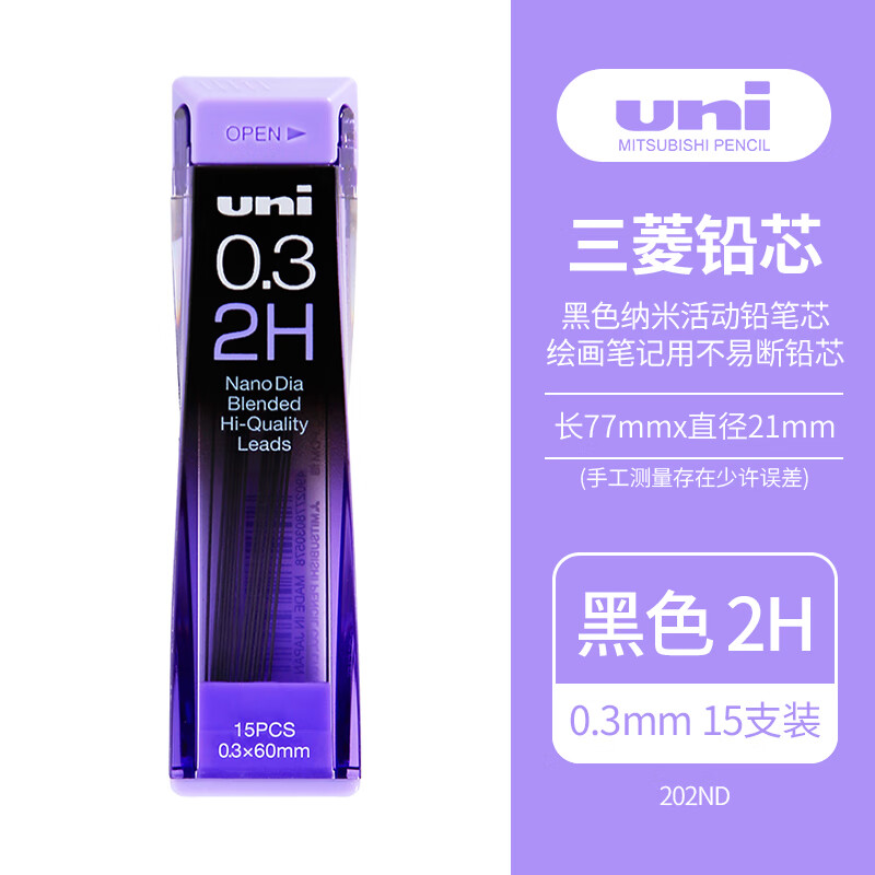 商品名称:三菱(uni)202ND黑色纳米活动铅笔芯0.3mm 自动铅笔替芯多规格学生绘画笔记用不易断铅芯 2H 15根/管 单位:管