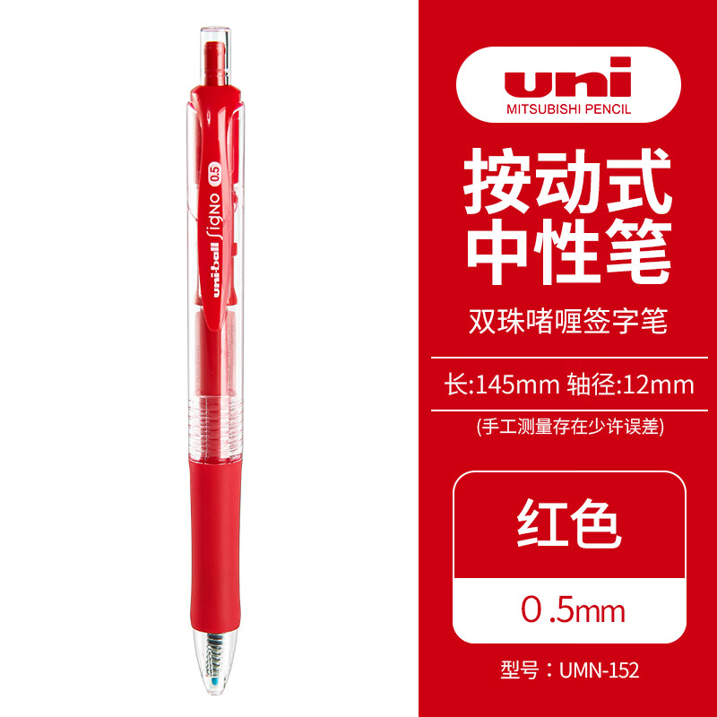 商品名称:三菱(Uni)UMN-152按动中性笔 0.5mm双珠啫喱笔学生考试签字笔(替芯UMR-85) 红色 单支装 单位:支