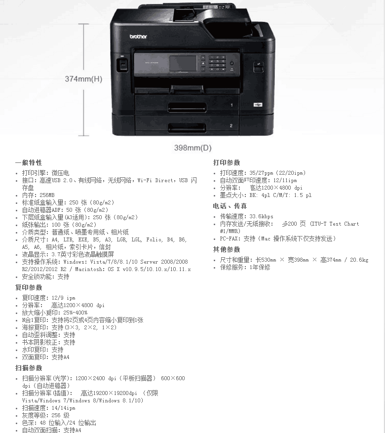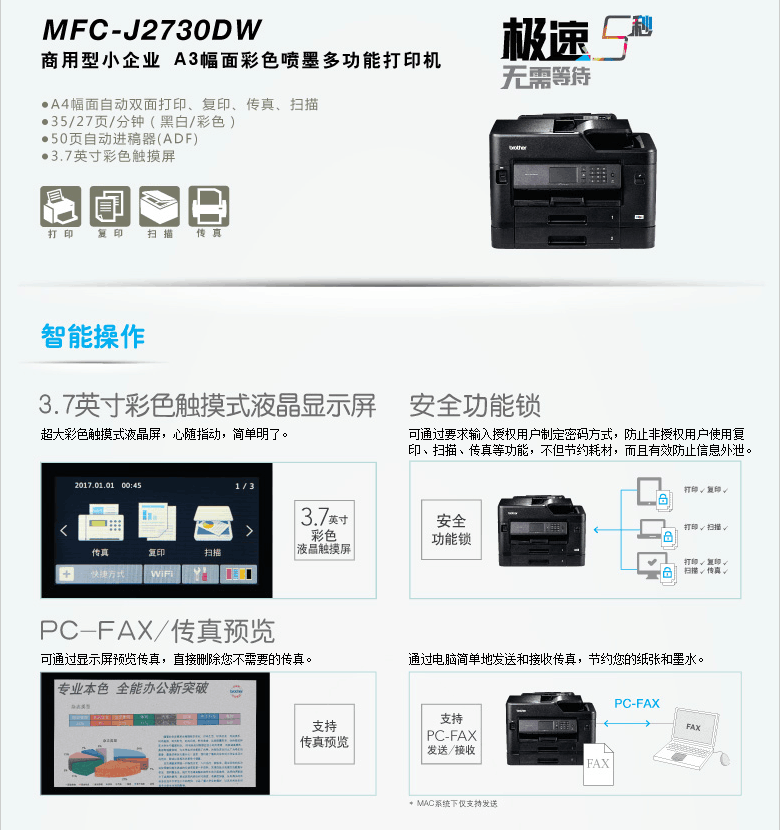 商品名称:兄弟 彩色喷墨A3打印A4扫描复印传真自动双面一体机 MFC-J2730DW