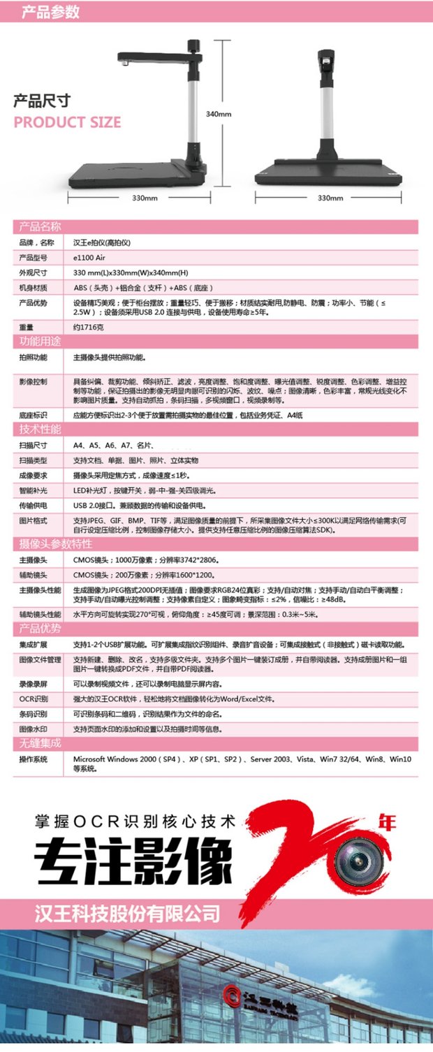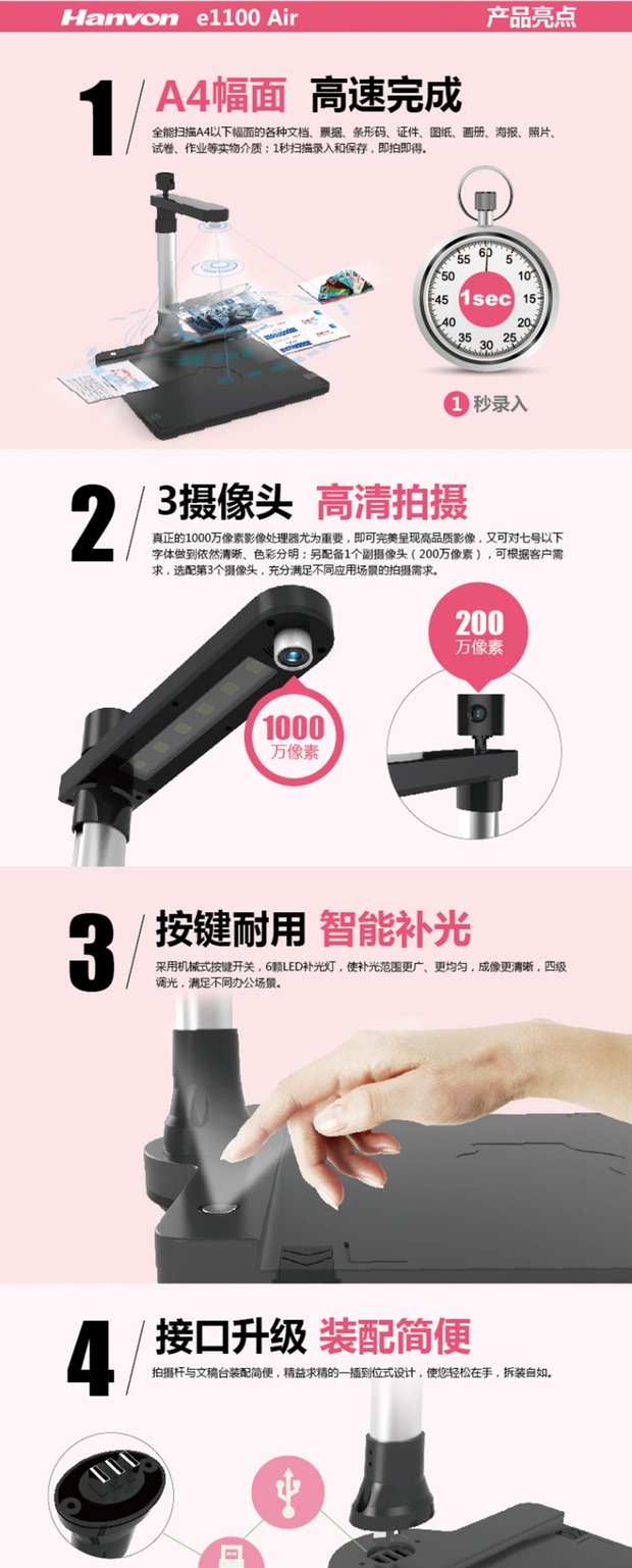 商品名称:汉王 高拍仪1000万A4高清高速便携扫描仪手持 e1100air