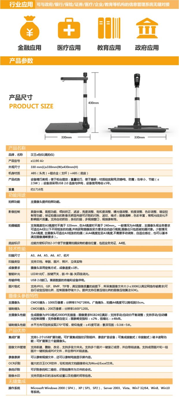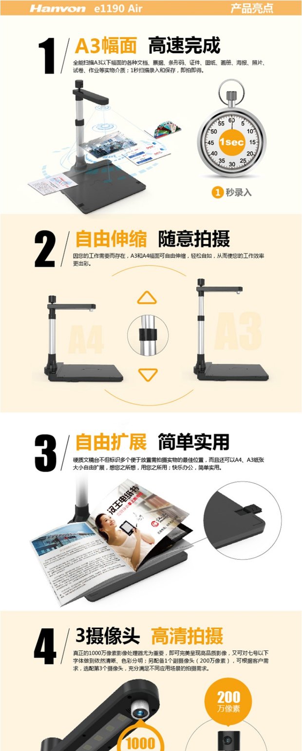 商品名称:汉王 高拍仪1000万像素a3A4便携式扫描仪高清高速拍摄仪 e1190air