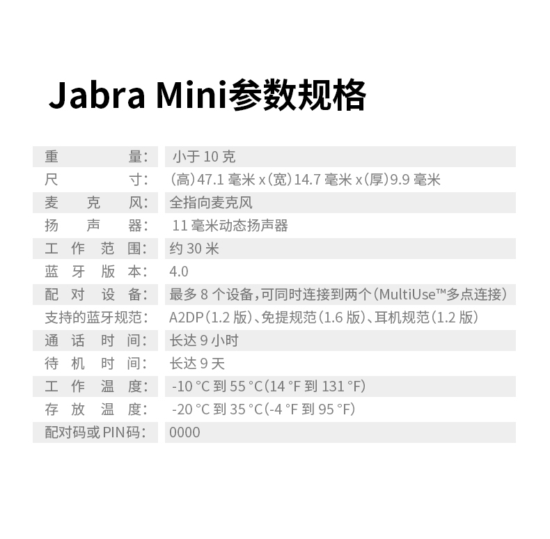 商品名称:捷波朗/Jabra 迷你无线蓝牙耳机耳麦挂耳入耳式耳塞式耳机 Mini