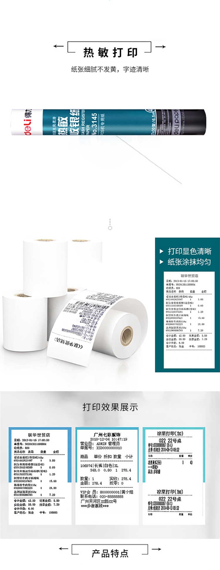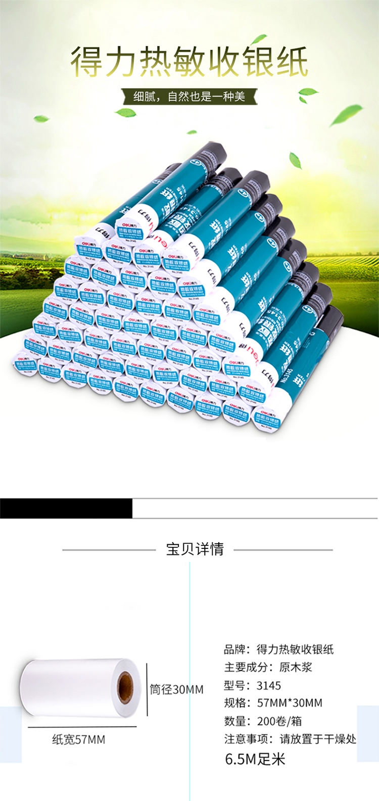 商品名称:得力 3145 57mm*30mm热敏收银纸/超市小票/收银机打印纸200卷/箱 3145