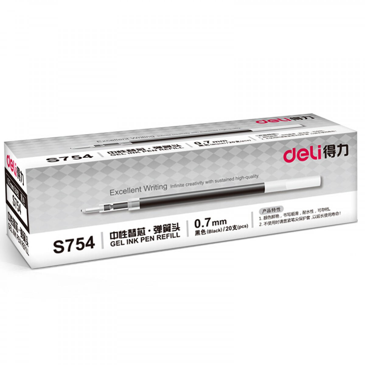 商品名称:得力 S754中性笔芯0.7mm弹簧头 水笔芯签字笔芯 20支/盒