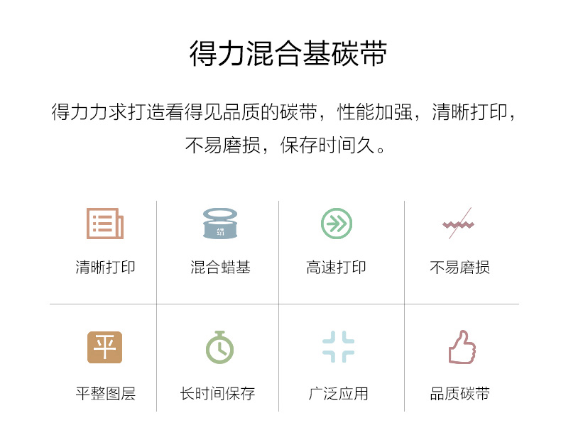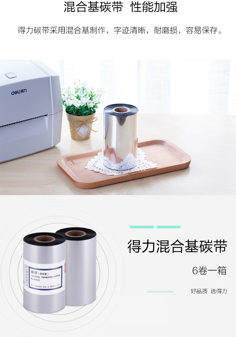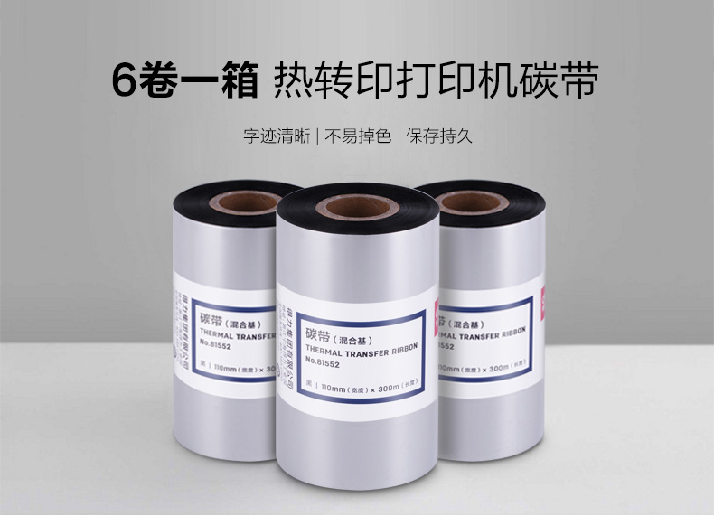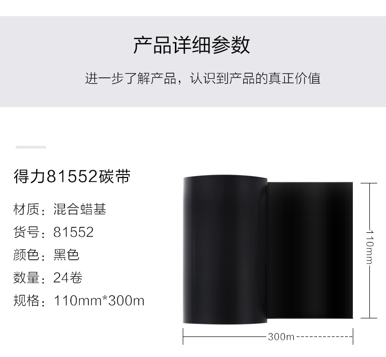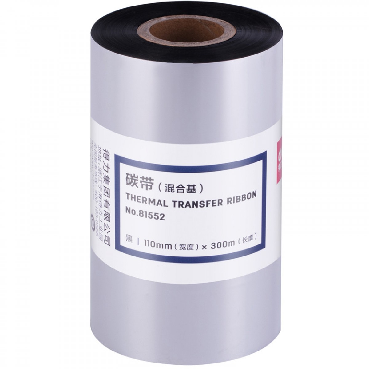 商品名称:得力 81552 混合基碳带110mm*300m铜版纸标签打印纸色带条码吊牌信息碳带卷筒装TSC碳带芯