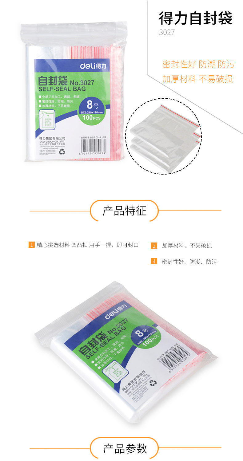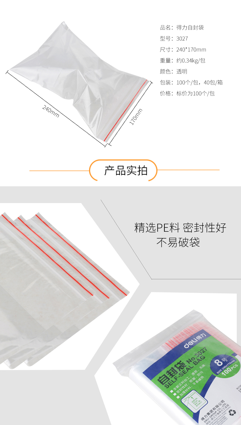 商品名称:得力 透明自封袋封口袋8号加厚塑料袋包装100只24*17cm办公用3027