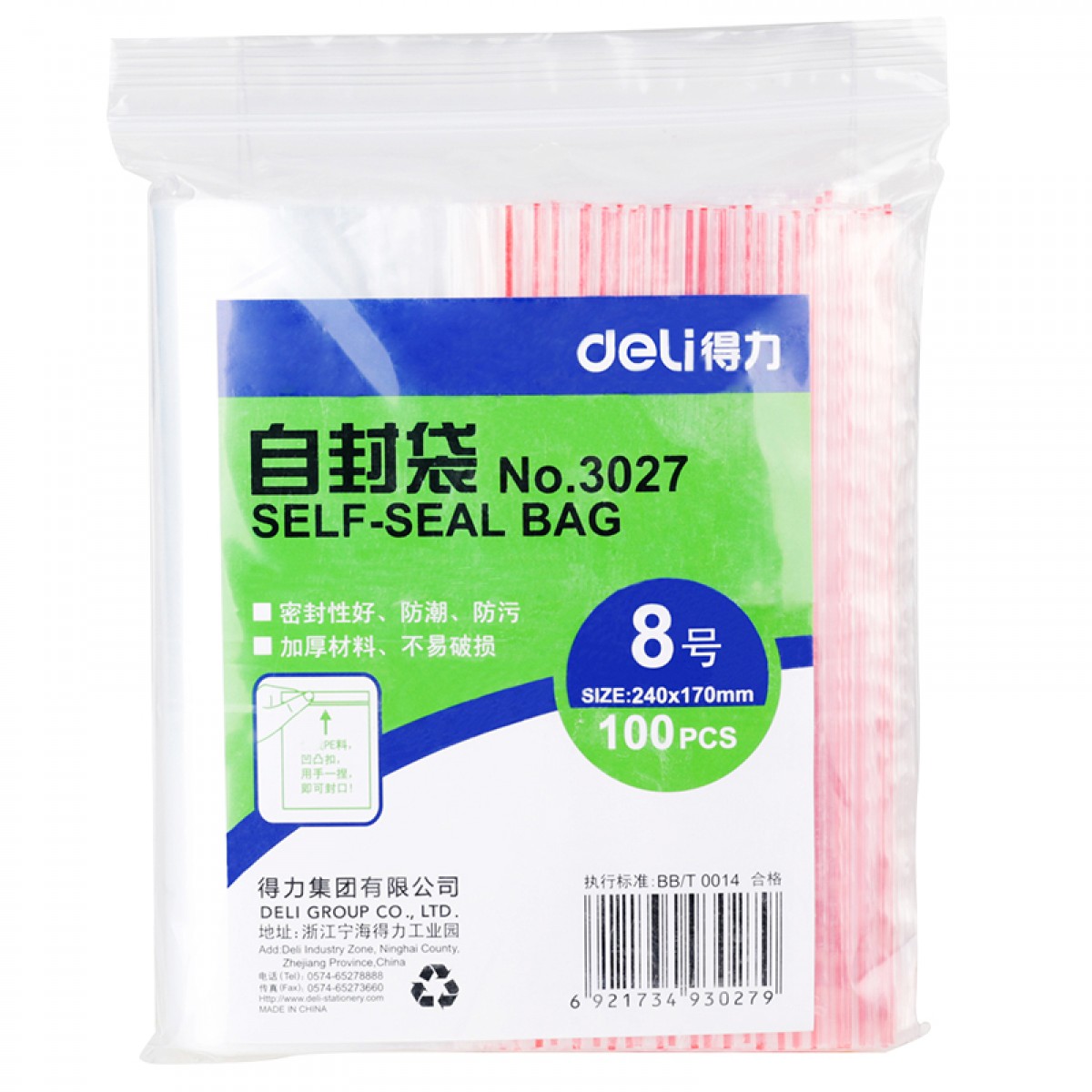 得力 透明自封袋封口袋8号加厚塑料袋包装100只24*17cm办公用3027