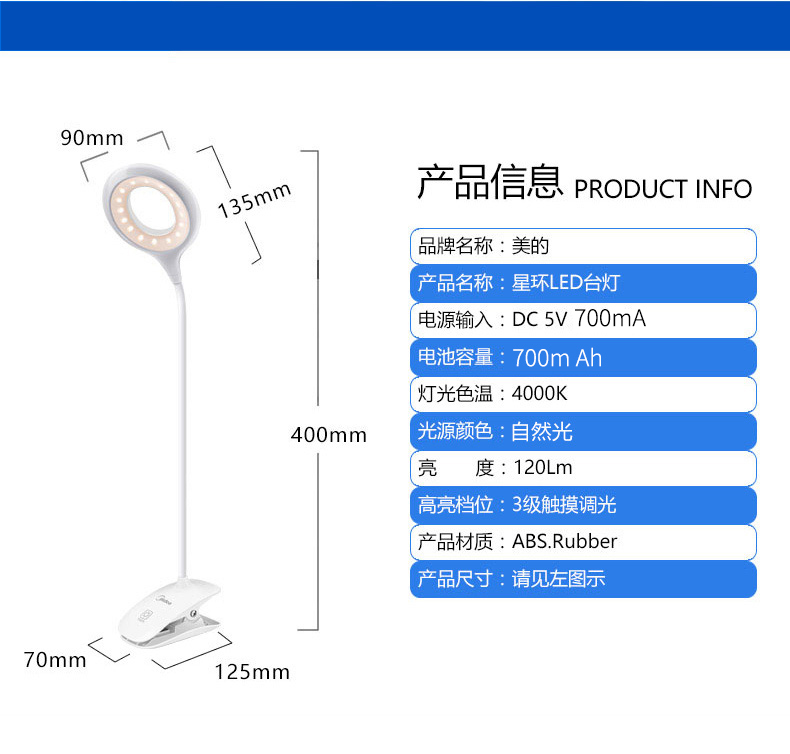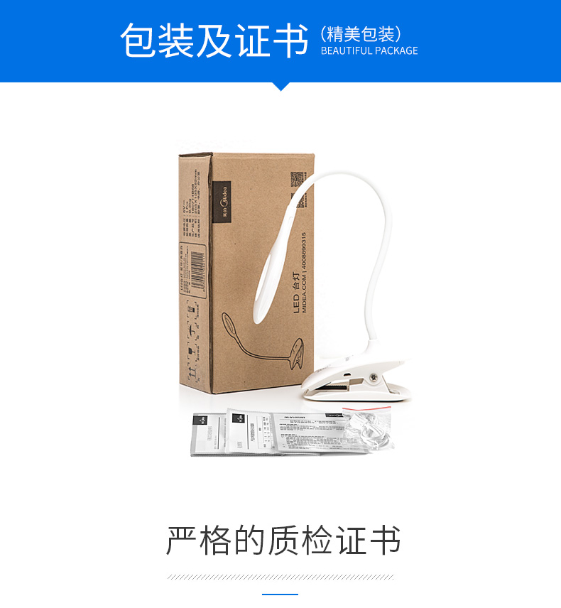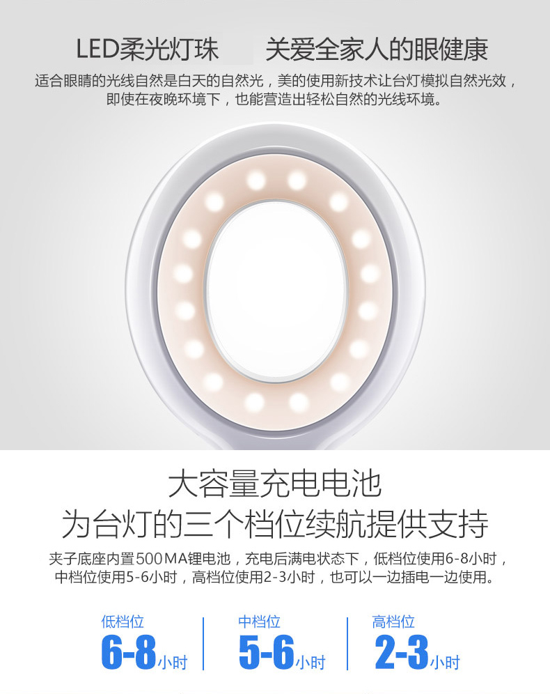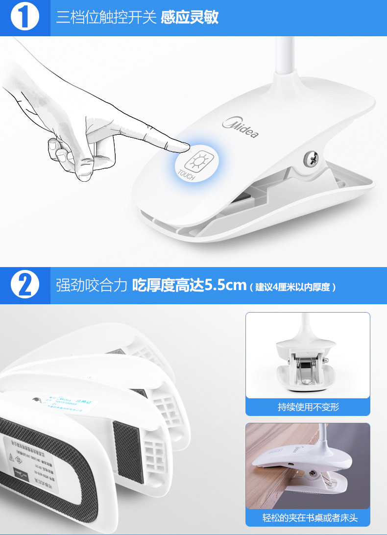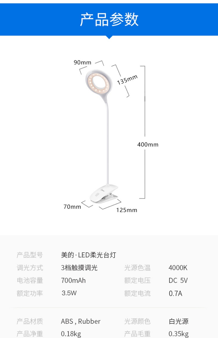 商品名称:美的 可充电式LED小台灯护眼书桌大学生宿舍卧室床头读书夹子夹式MTD3-MK-01