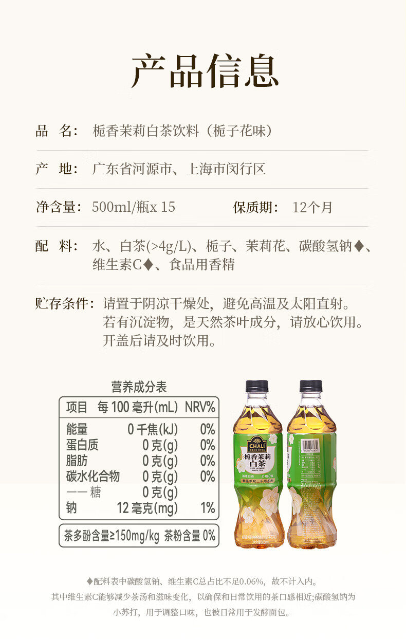 商品名称:茶里 茶饮料栀香茉莉白茶500ml15瓶整箱装