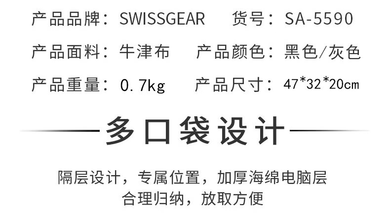 商品名称:瑞制swissgear双肩包防水背包电脑包男学生书包运动休闲男包女包5590 单位:个