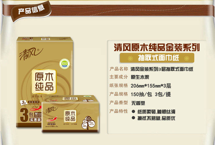 商品名称:清风 原木纯品金装系列150抽3层抽纸M中规格面巾纸整箱12包BR36MJ