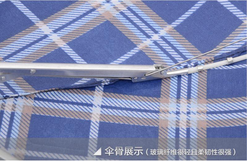 答:这款伞的骨架是玻璃纤维+超轻铝合金关节支架(一般不懂的人说是塑料),玻璃纤维的优点是:轻巧、柔韧性好、不会生锈,减轻伞的重量的同时,质量上反而比钢铁伞骨的更耐用哦!