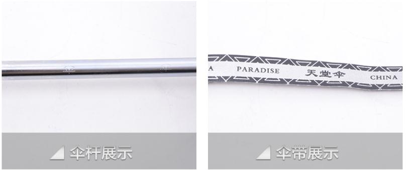 答:这款伞的布料是高密拒水碰击布,只防雨的不防紫外线的哈,雨伞布料不厚的属于薄的,伞面经过仿荷叶处理不沾水一甩干效果非常明显的!