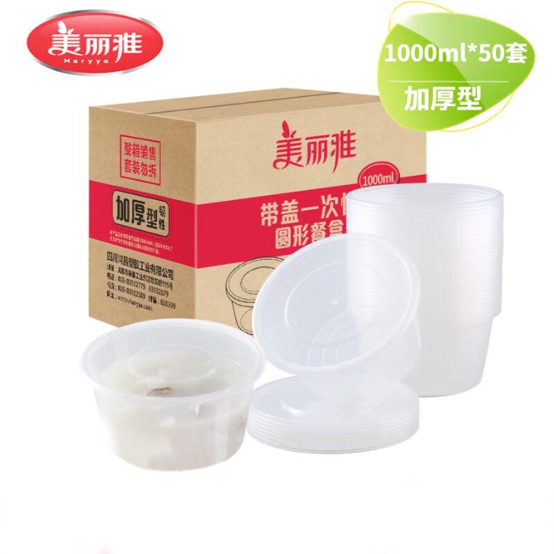 商品名称:美丽雅 一次性饭盒食品级餐盒带盖 快餐外卖打包盒 野餐盒可微波饭盒 圆形带盖 1000ml*50套 单位:箱