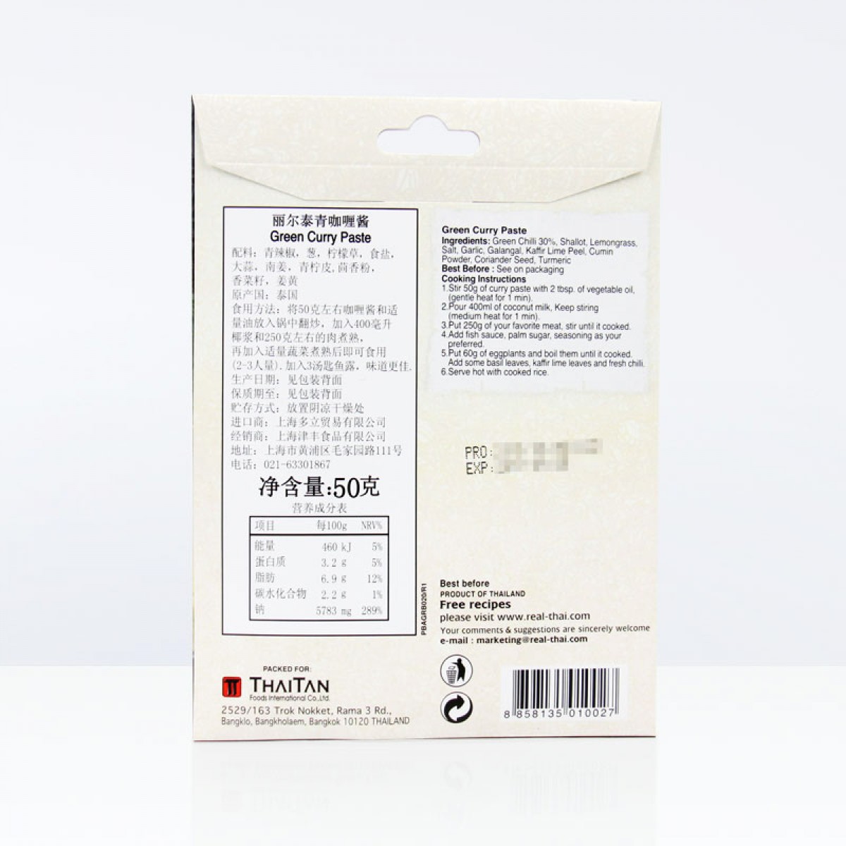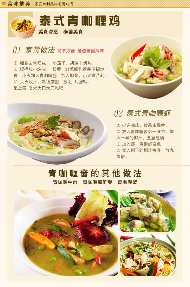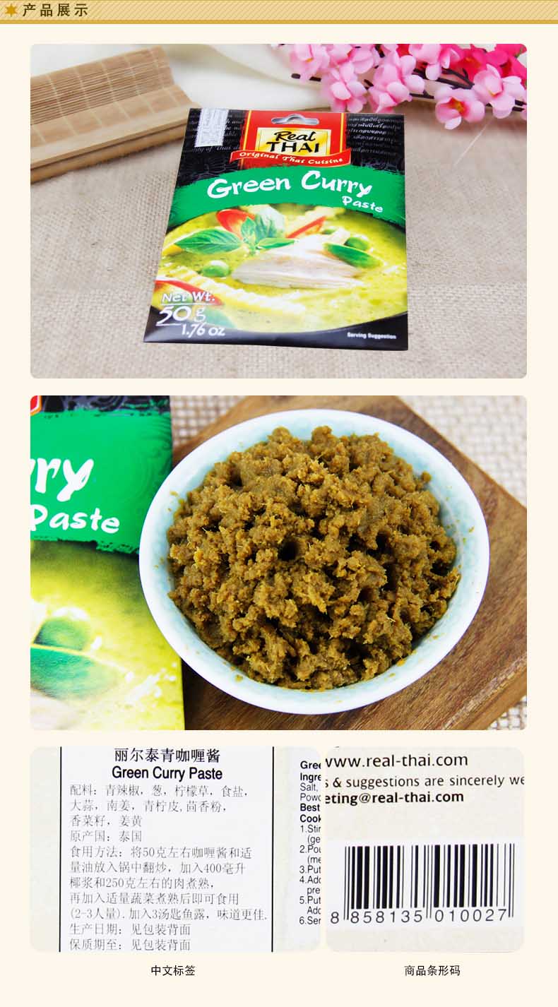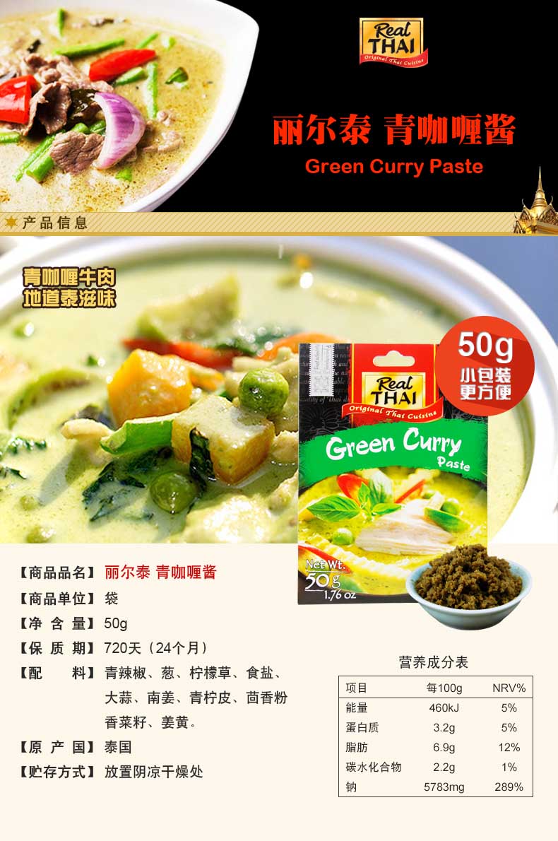 商品名称:丽尔泰 泰国进口青咖喱酱(纸袋)50g/包火锅酱咖喱鸡