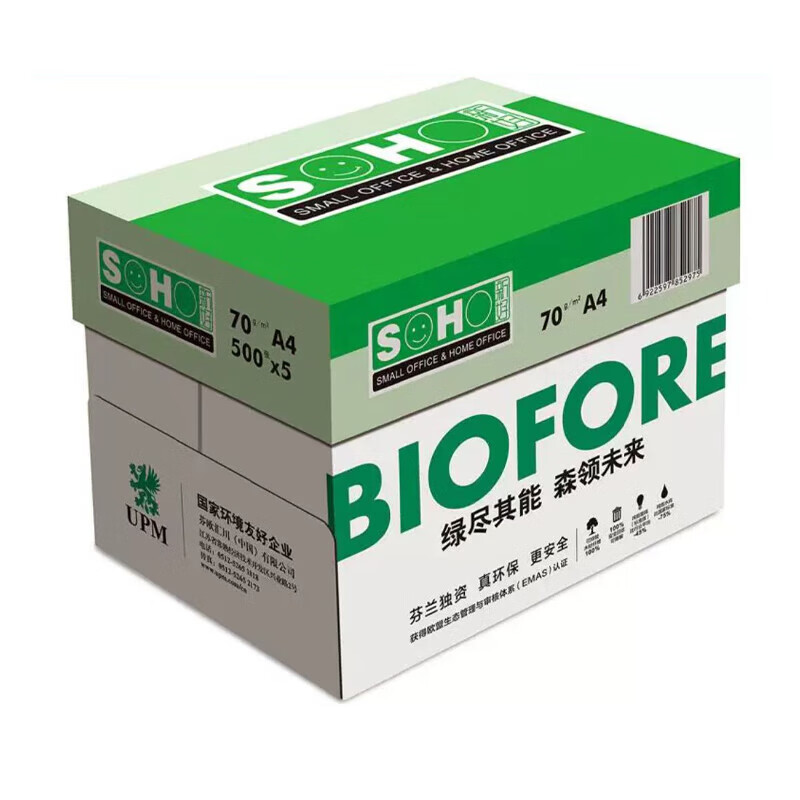 商品名称:UPM 绿新好A4打印纸双面打印复印纸可手写办公室打印专用双面使用 80克 A4【5包/箱,500张/包】 单位:箱