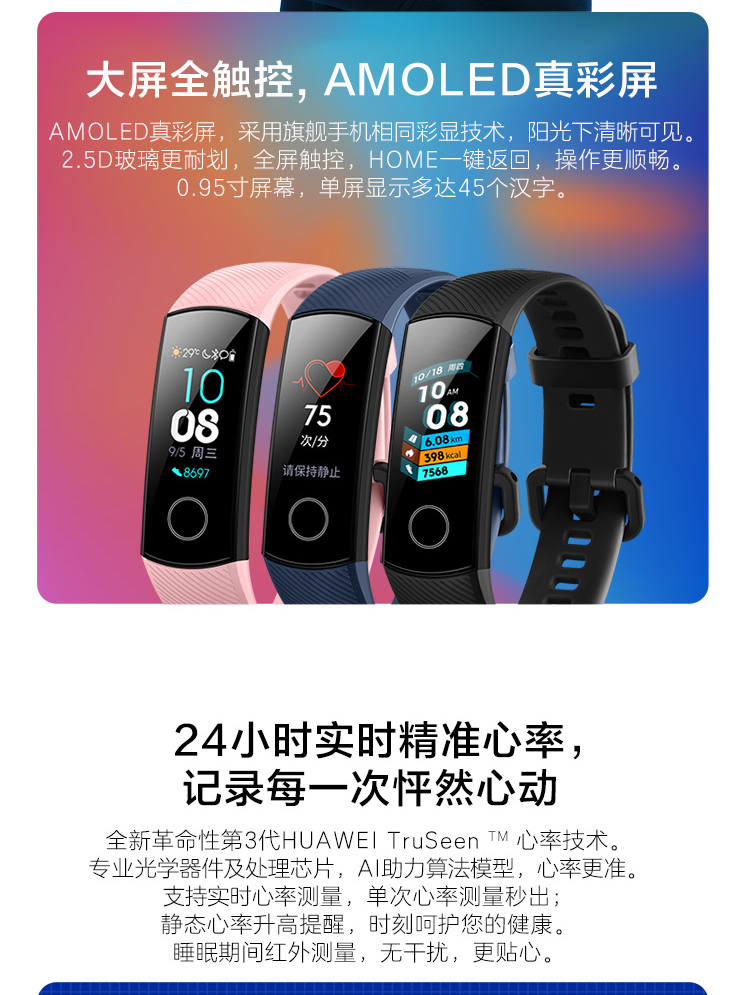 荣耀 运动智能计步心率彩屏触控计步器3nfc手表 手环4
