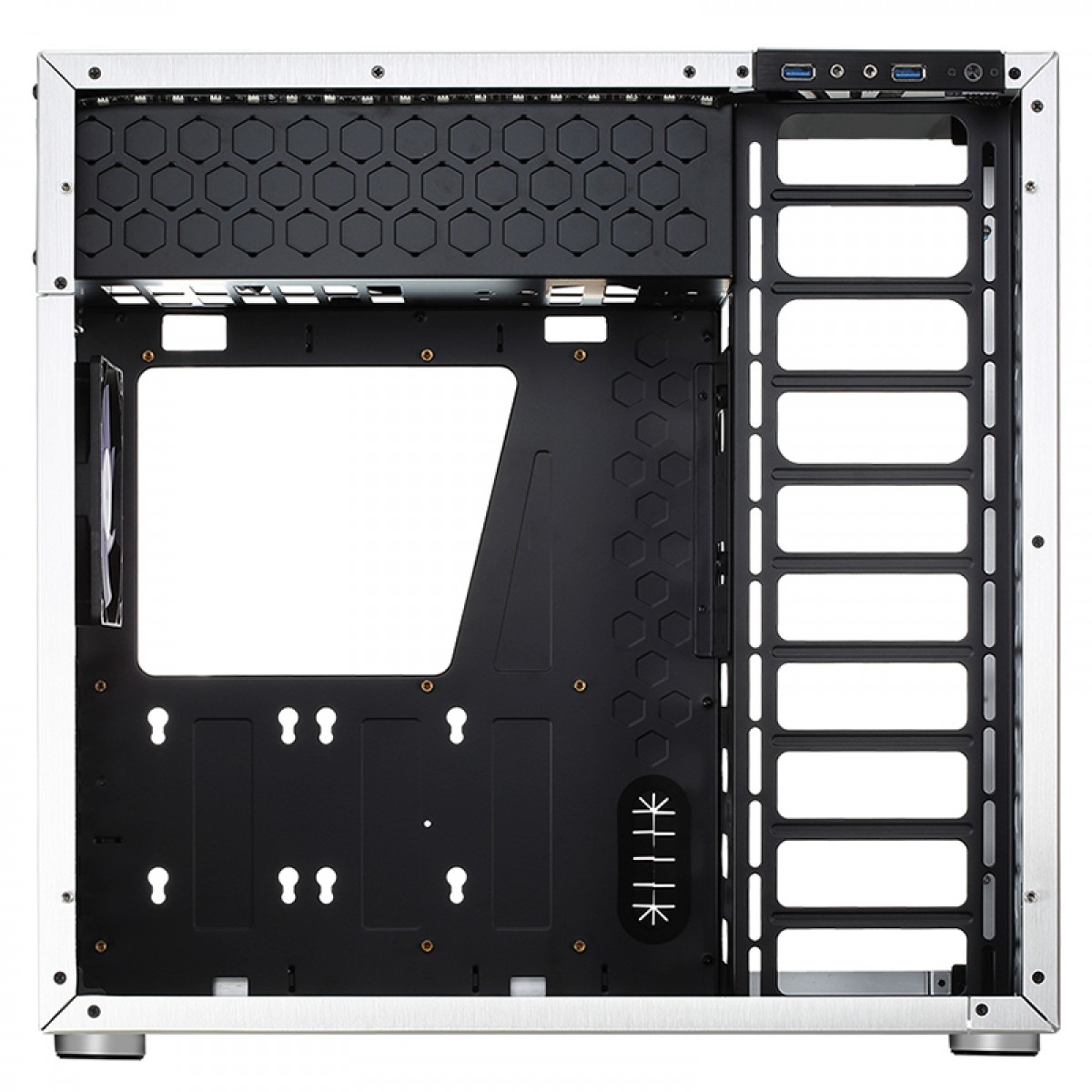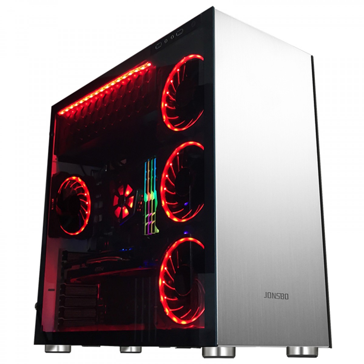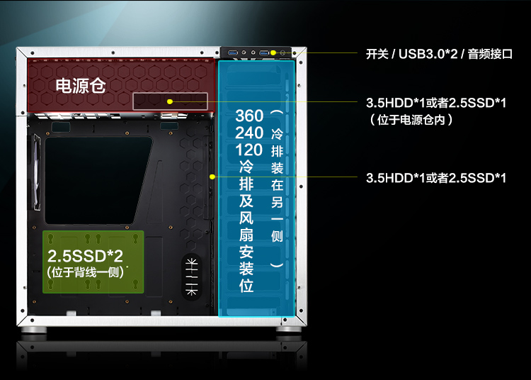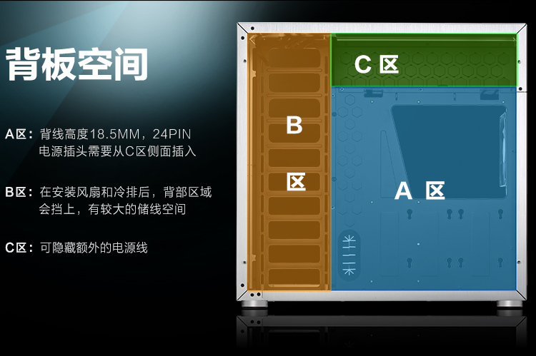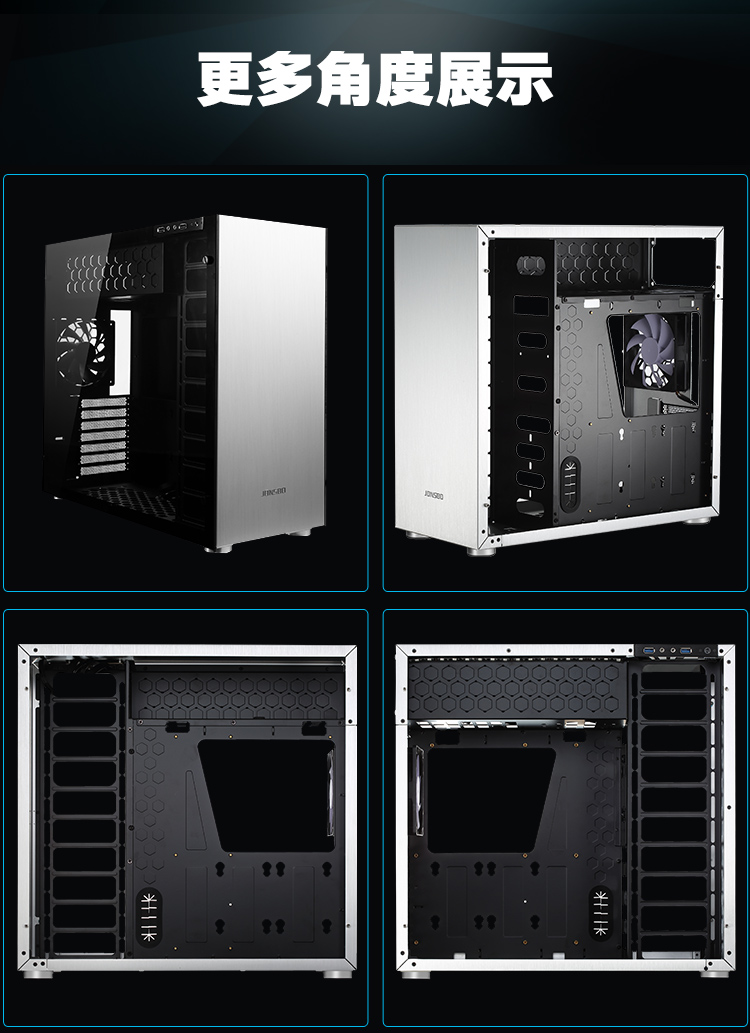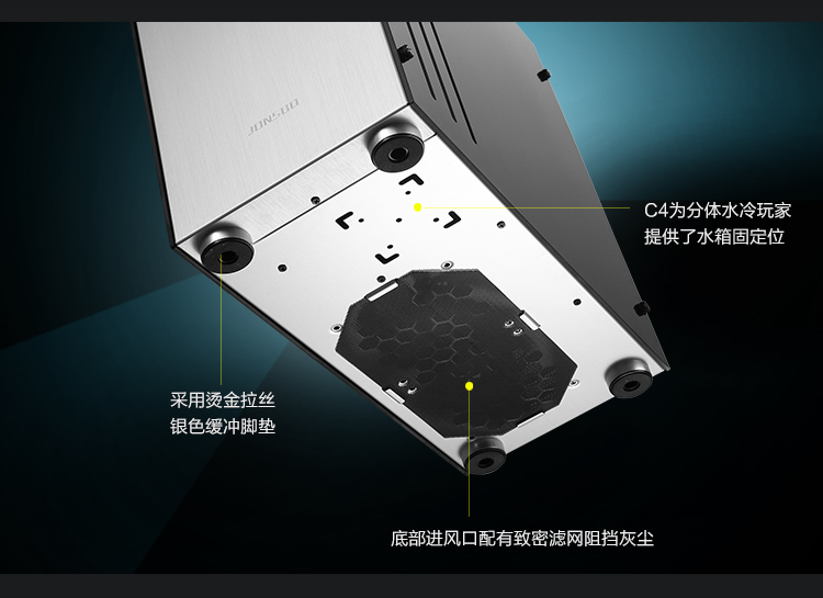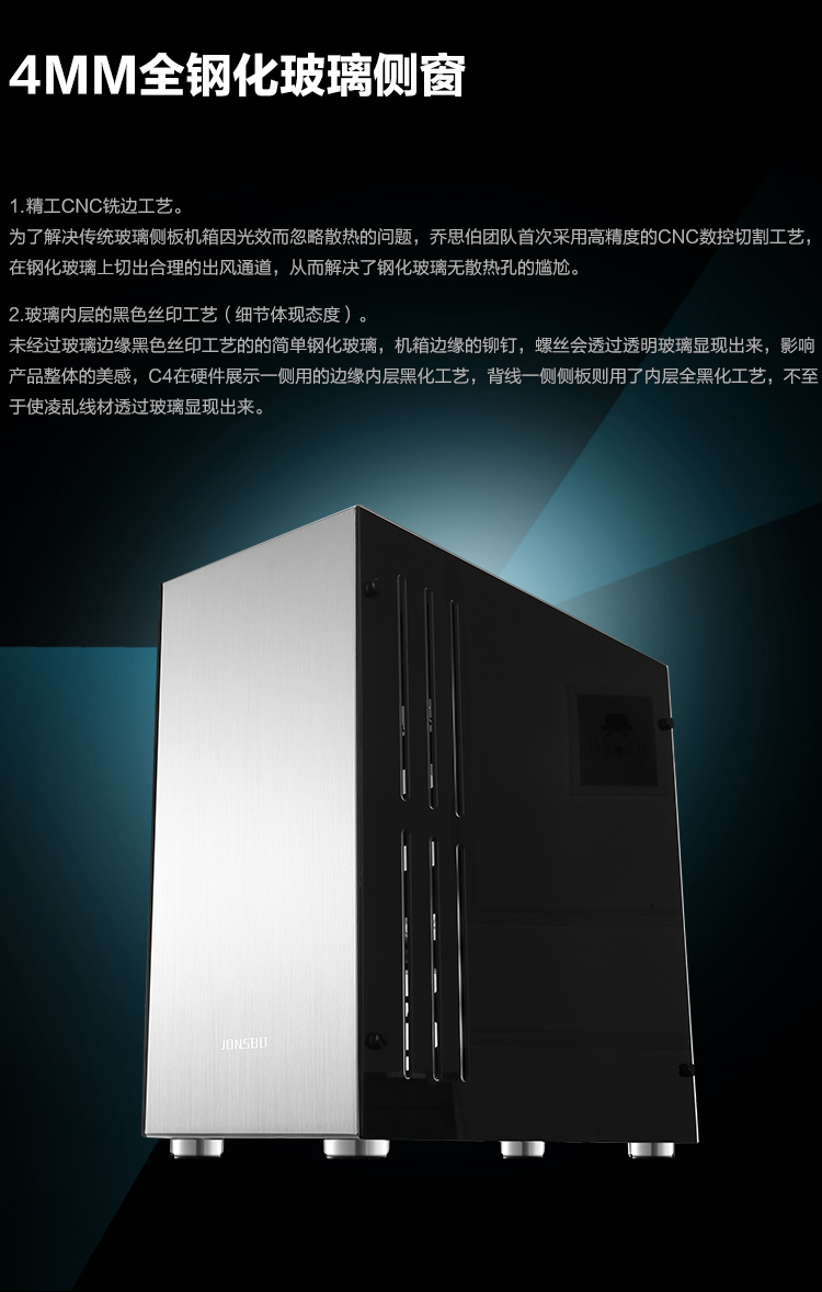 C4是乔思伯团队在2017年下旬推出一款定位于光效型的ATX机箱产品。产品外壳采用1.5MM板材制作,分钢板烤漆版本以及铝镁合金材质版本。在结构设计上,C4创新的采用了前板侧风扇位的架构设计,冷排可以安装在风扇架背面,从而可以隐藏冷排出线口及多余水管。为了解决传统玻璃侧板机箱为了光效而忽视散热的问题,乔思伯团队首次采用高精度的CNC数控切割工艺在钢化玻璃上切出合理的出风通道,从而解决了钢化玻璃侧板无散热孔的尴尬。