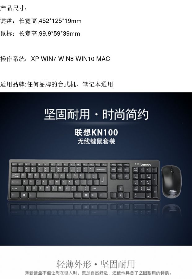 商品名称:联想 无线键盘鼠标套装 静音省电超薄电脑办公游戏键鼠 KN100