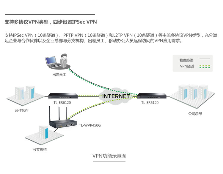 支持10条IPSec VPN隧道,满足公司总部与分支机构、合作伙伴之间的远程安全连接需求。