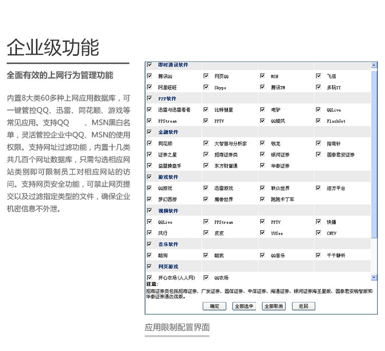 内置4大类近40种上网应用数据库,可一键管控QQ、迅雷、同花顺、游戏等常见应用。可将企业不同部门划分为不同用户组,给予不同的上网权限,并可自定义受控时间段,实现休息时间/工作时间分开管控。对于特殊用户,可根据需要设置例外QQ,满足有需要的员工使用QQ的需求。