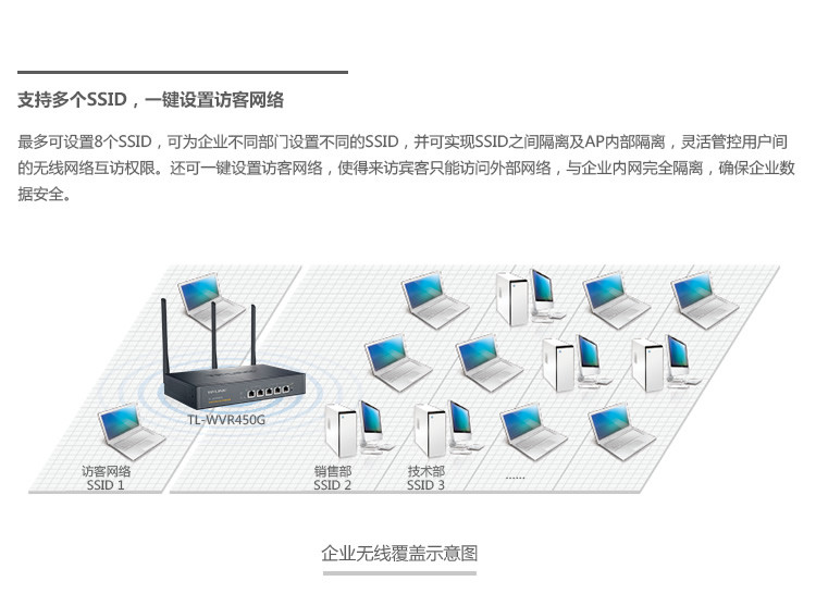 无线局域网因其使用方便、投入低廉等特点,逐渐成为企业组网新的趋势,尤其是对于广大中小企业而言,无线局域网日益成为组建企业网络时的首要选择。企业无线网络中需要承载的业务类型日益多样化,网络流量日益增长,对于网络稳定性、数据传输速率、可管理性等都提出了更高的要求。为此,TP-LINK全新推出450M无线企业VPN路由器TL-WVR450G,助力企业实现可靠、高速、易管控的无线局域网覆盖。