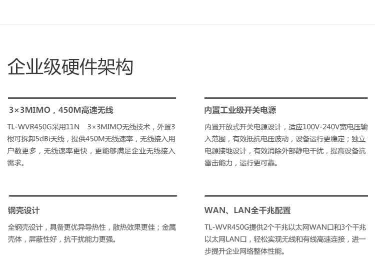 TL-WVR450G基于高通高性能网络处理器开发,采用802.11N 3×3 MIMO无线技术,提供450M无线传输速率,并配备2个千兆以太网WAN口和3个千兆以太网LAN口,轻松实现无线和有线高速连接,进一步提升企业网络整体性能。同时支持IPSec/PPTP/L2TP VPN、上网行为管理、智能双向IP带宽控制、连接数限制、ARP防护、攻击防护、双WAN口负载均衡等丰富的软件功能。