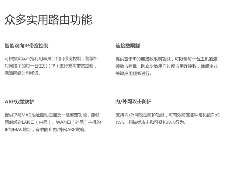 支持智能IP带宽控制功能,可根据实际的带宽利用率灵活启用带宽控制策略,可针对网络中每一台主机(IP)进行双向带宽控制,有效抑制BT、迅雷等P2P应用过度占用带宽,避免造成网络游戏卡、上网速度慢的问题,保障网络时刻畅通。