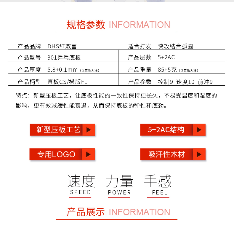 商品名称:红双喜 狂飙H301乒乓球底板7层芳碳碳素乒乓球拍底板