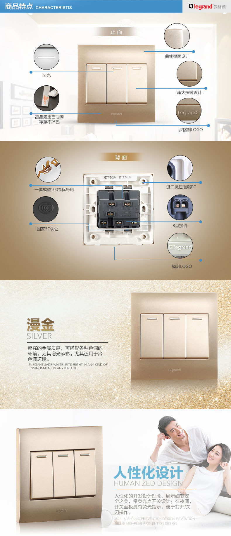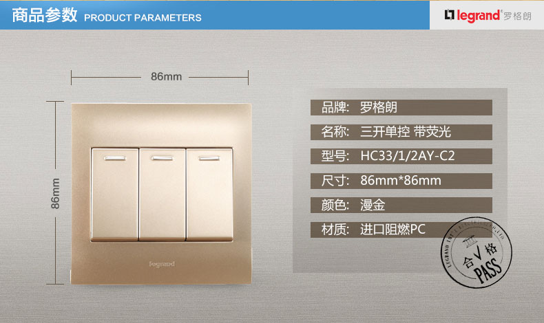 商品名称:罗格朗 三位单控带荧光开关面板86型三开单控荧光3开墙壁开关