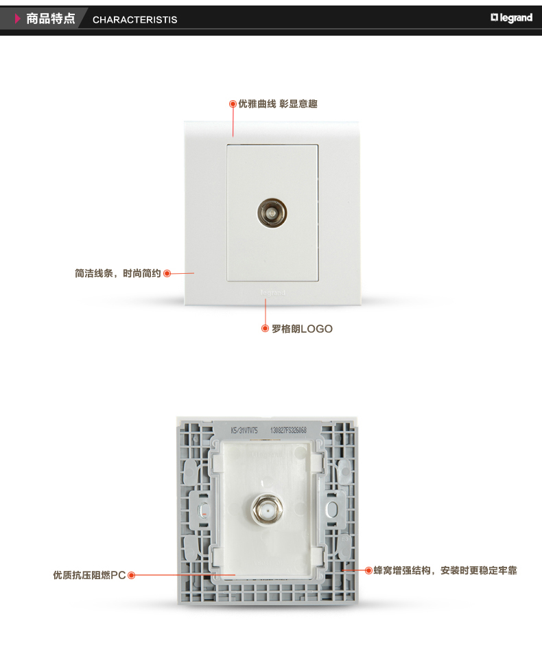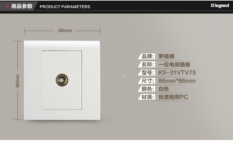 商品名称:罗格朗 有线电视插座面板闭路插座有线插座 电视机插座面板86型 K5/31VTV75