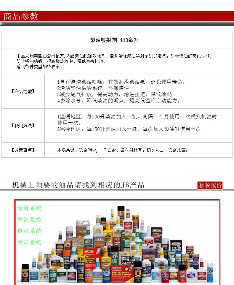 商品名称:JB 柴油发动机喷射剂除积碳去除水份润滑油泵路虎柴油添加剂