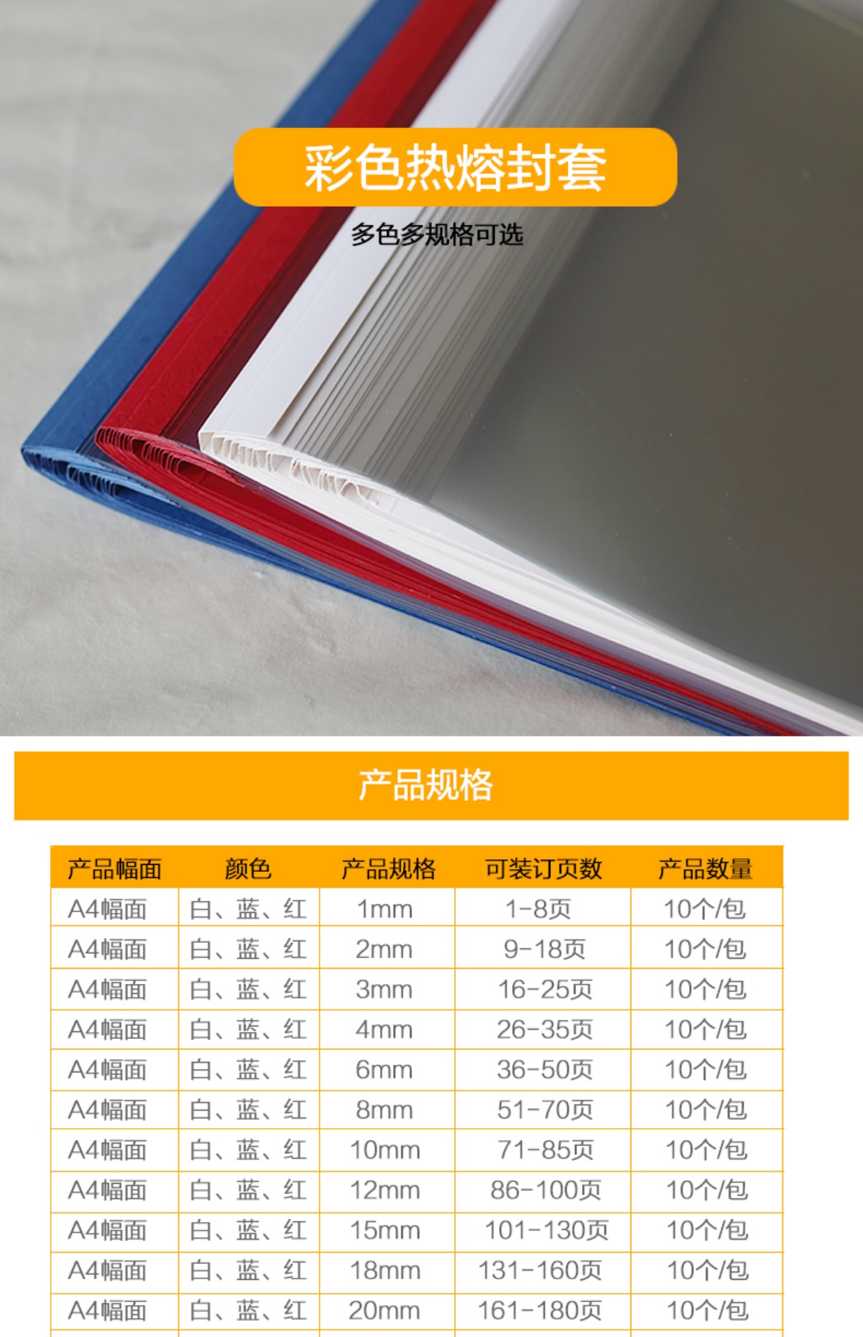 商品名称:道顿 A4 合同 标书 文件 书本塑料彩色热熔封套 胶装透明封面 带侧胶纸质封皮 热熔装订机 27-50mm