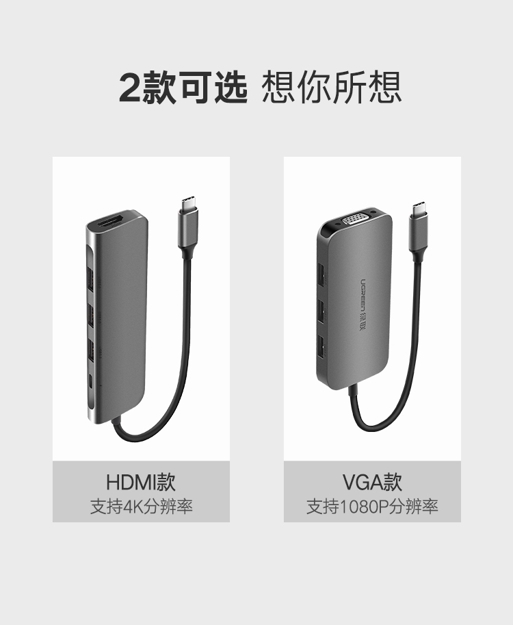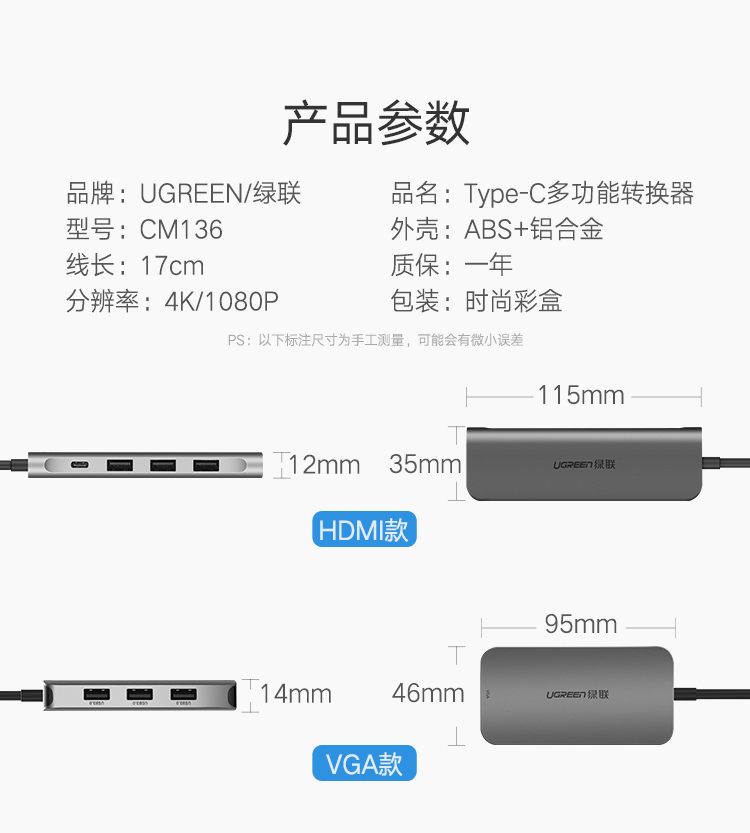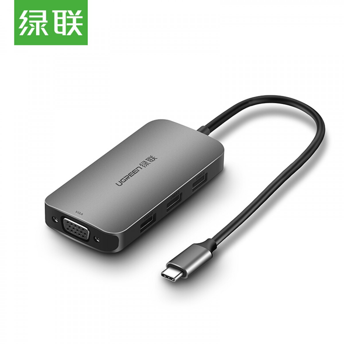 商品名称:绿联CM136Type-C扩展坞USB-C转3.0HUB+VGA转换器 带PD充电50210