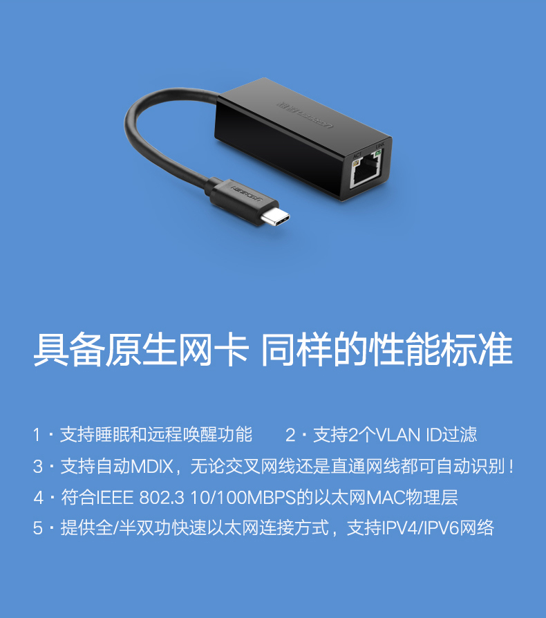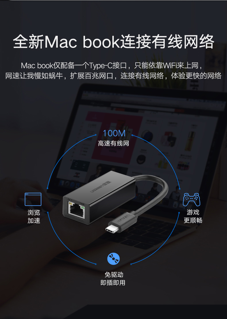 商品名称:绿联30287 Type-C转网线接口适配器百兆网卡转接 USB-C网口转换器