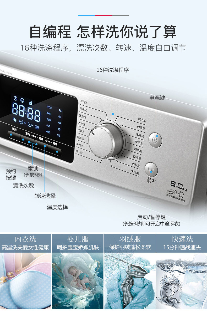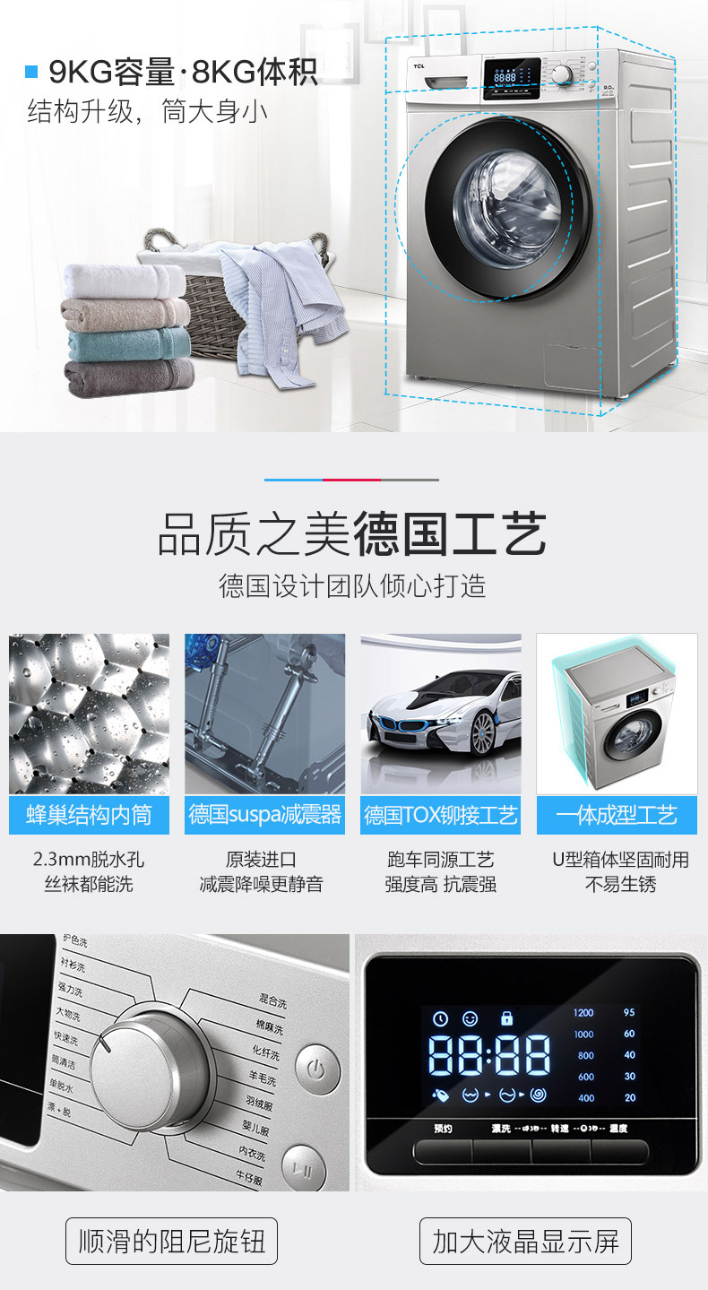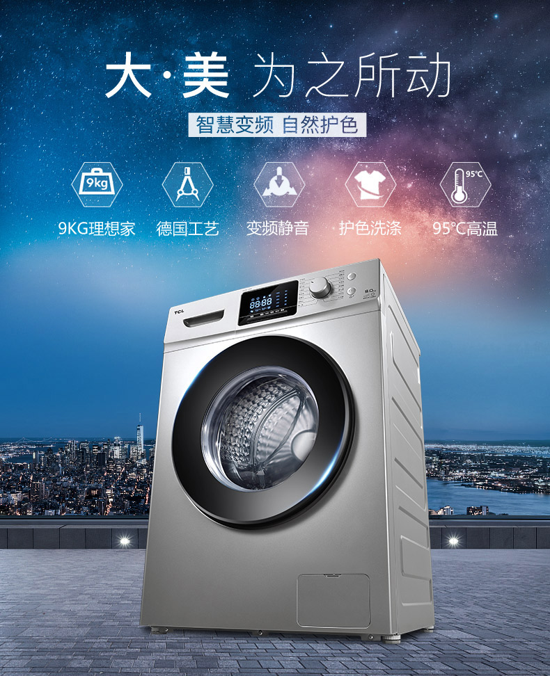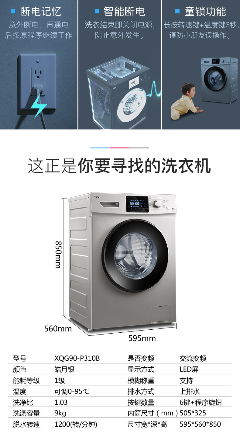 商品名称:TCL 9公斤智控变频滚筒全自动洗衣机 XQG90-P310B