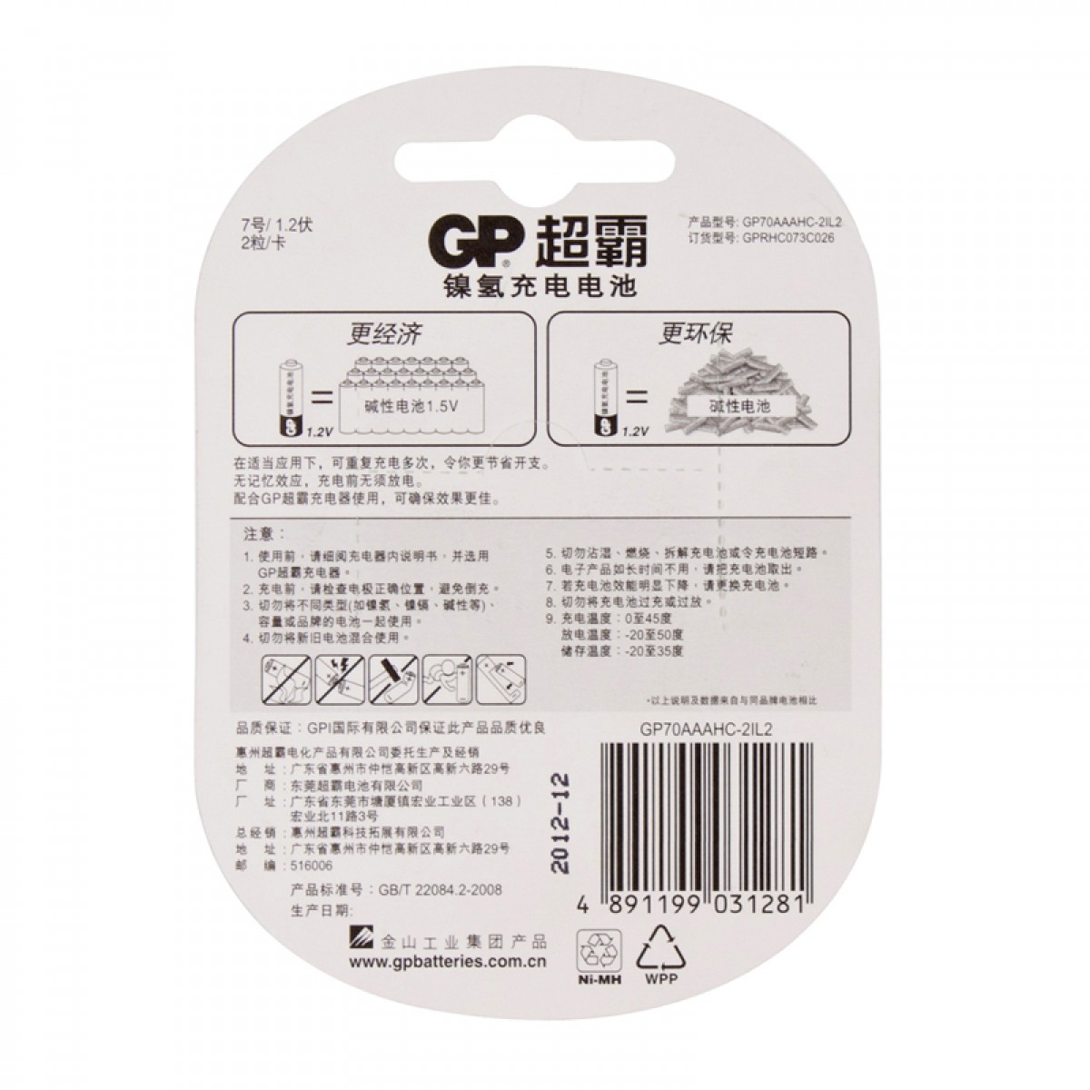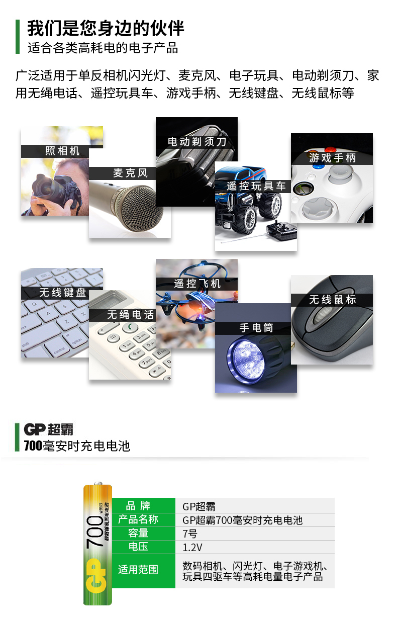 商品名称:GP超霸 7号电池七号镍氢充电电池 2节