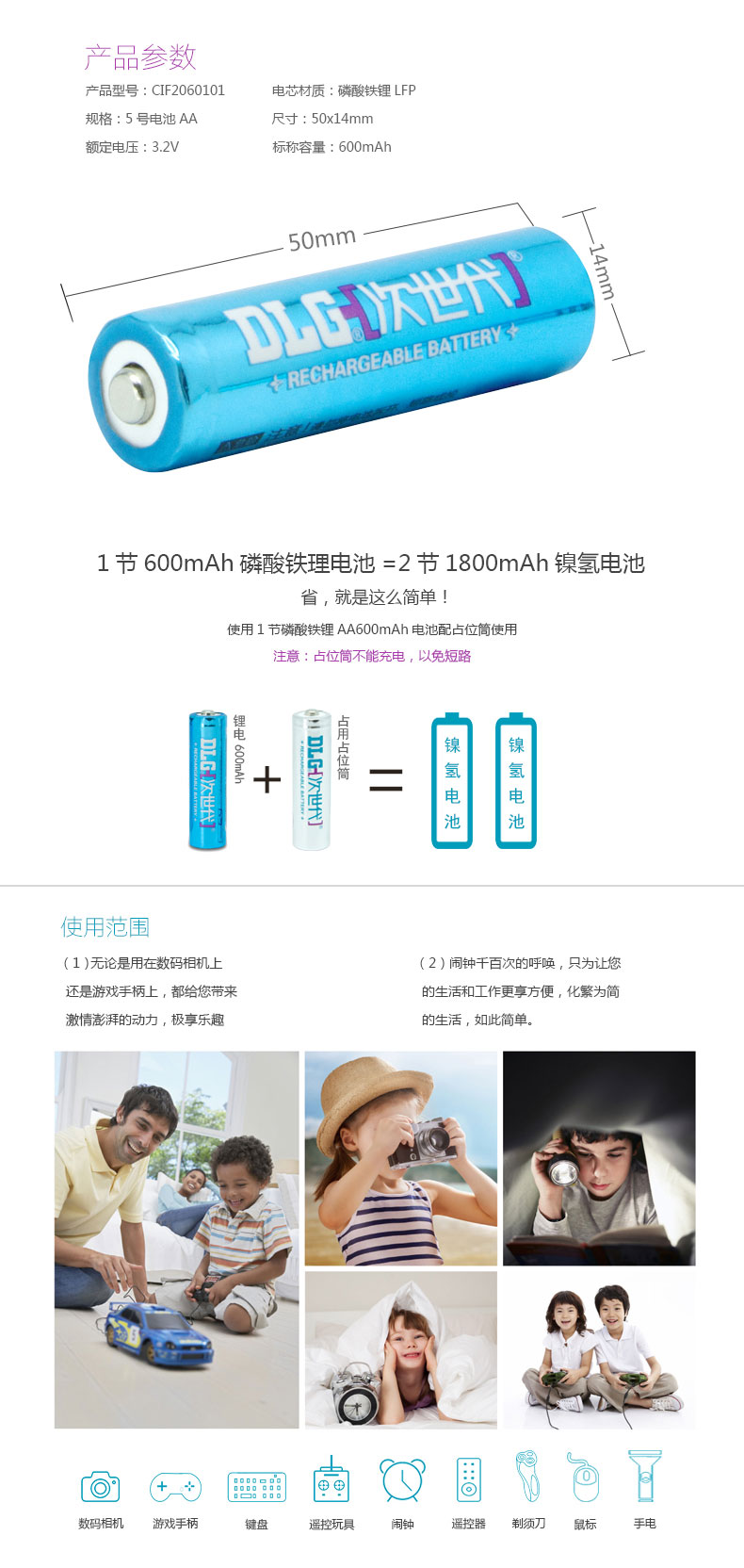 商品名称:次世代 5号充电电池磷酸铁锂电池600MAH CIF2060101