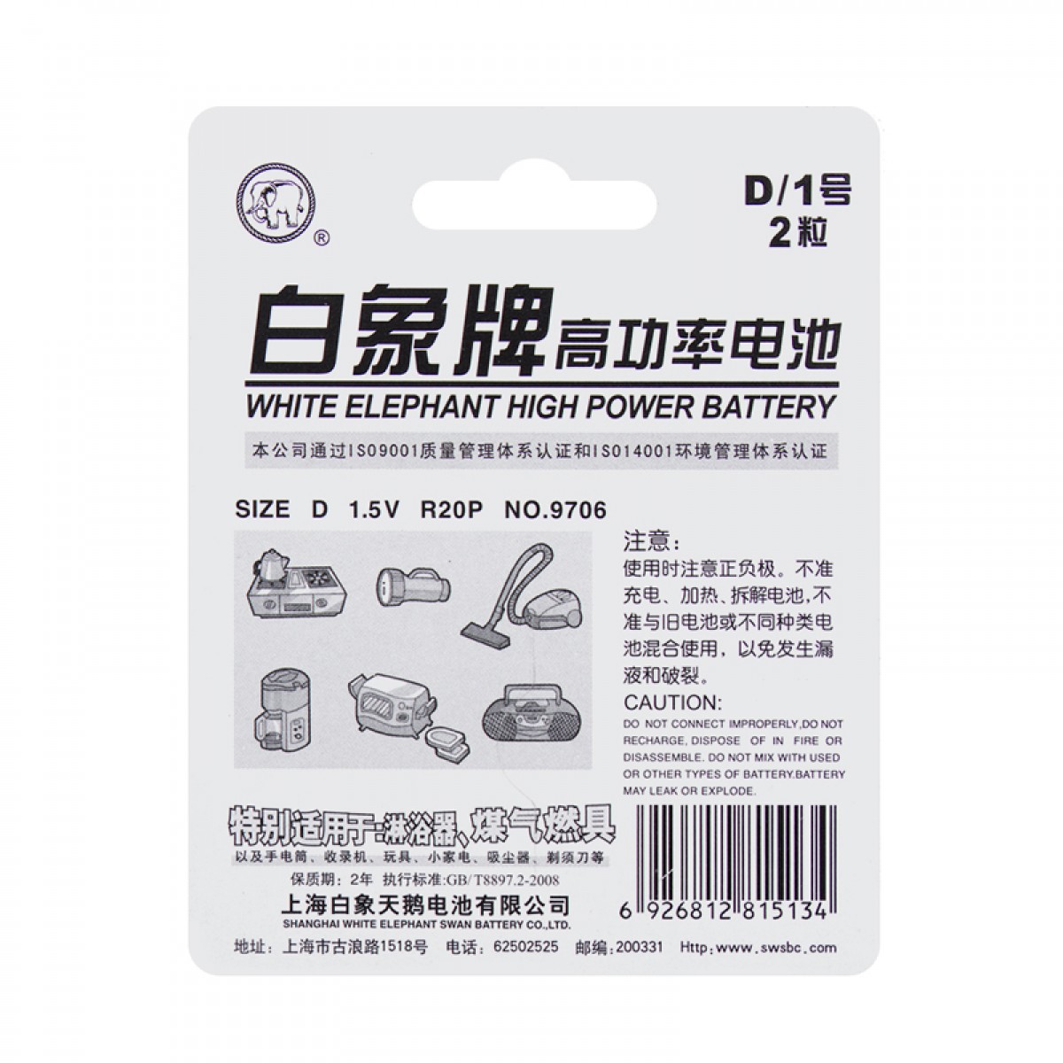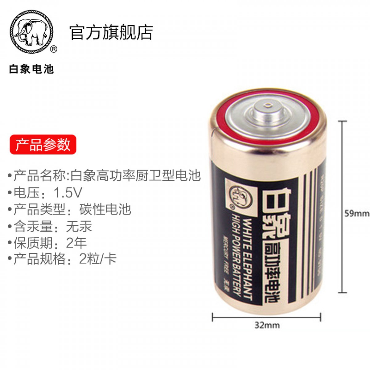 商品名称:白象 高功率电池厨卫型 大号1号2粒1.5V干电池 R20P