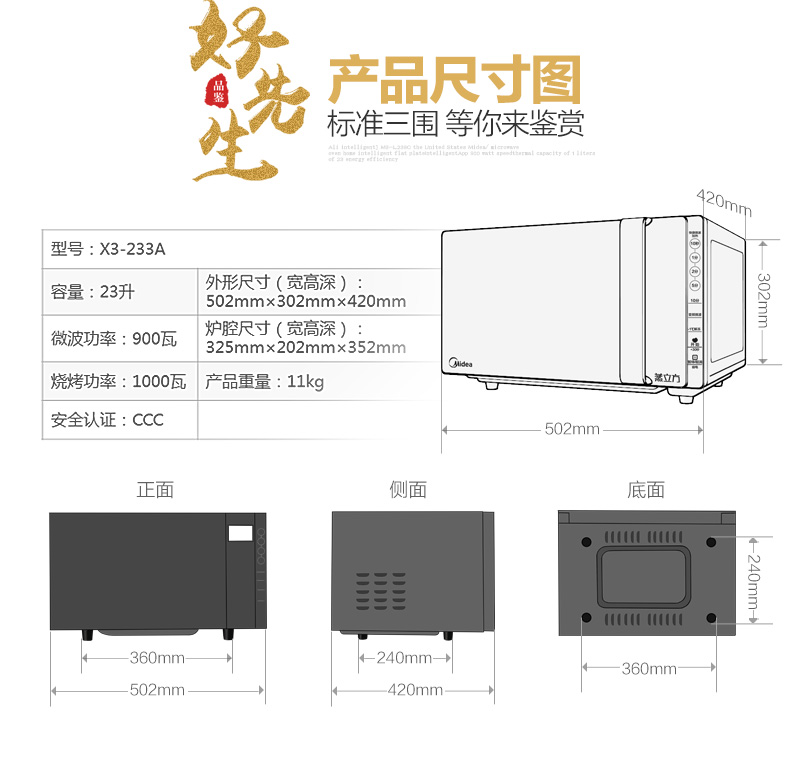 商品名称:美的 微波炉变频智能冷热火蒸汽光波炉 X3-233A