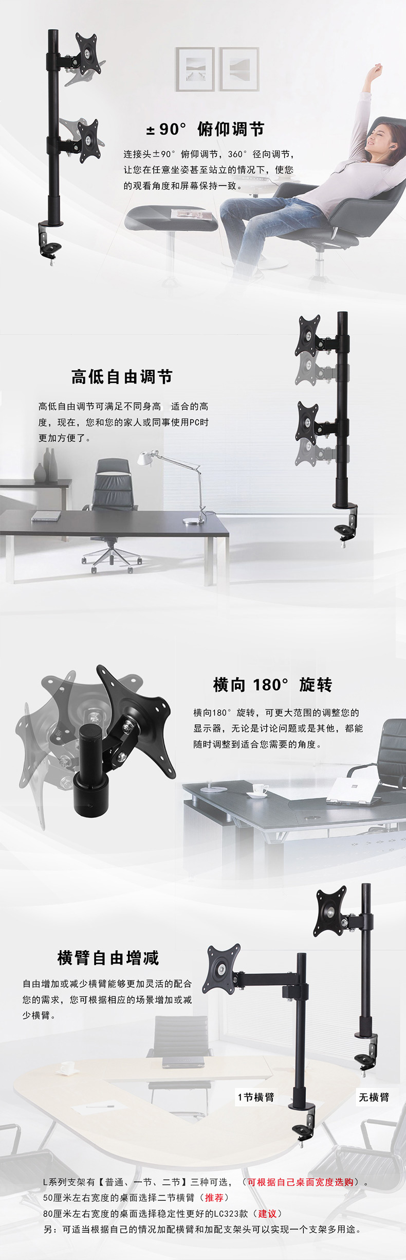 如何选择横臂长度:建议以自己的桌面宽度来选择,桌宽50厘米选择一节横臂为佳。桌宽80厘米建议选购二节合适。