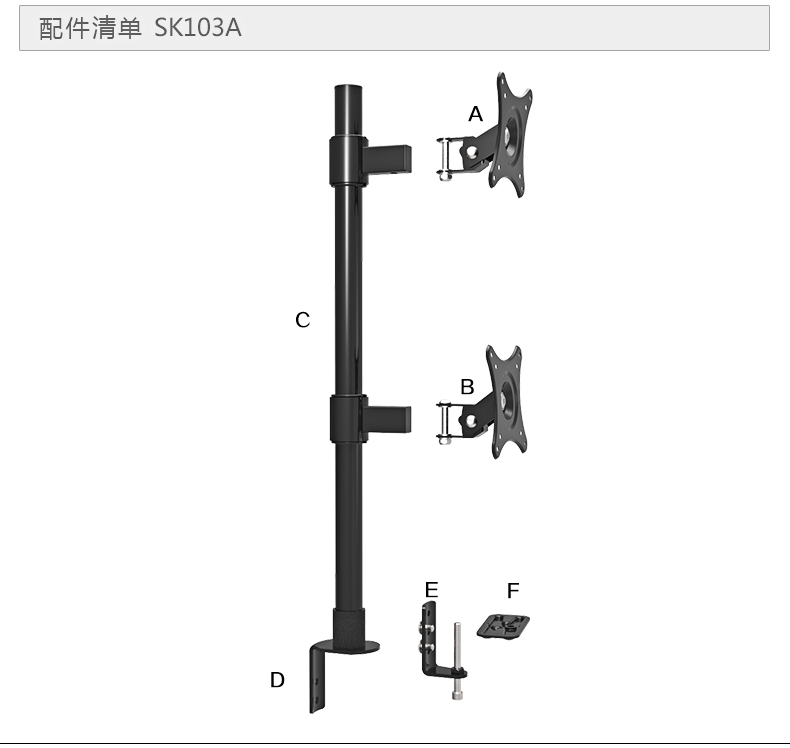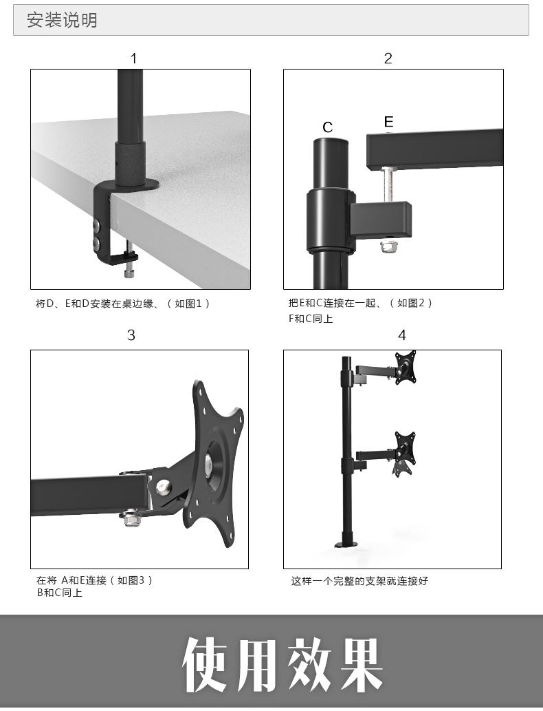 安装方式有:【桌夹】适合无孔桌面和【穿孔】适合有孔桌面此链接为桌夹安装方式。