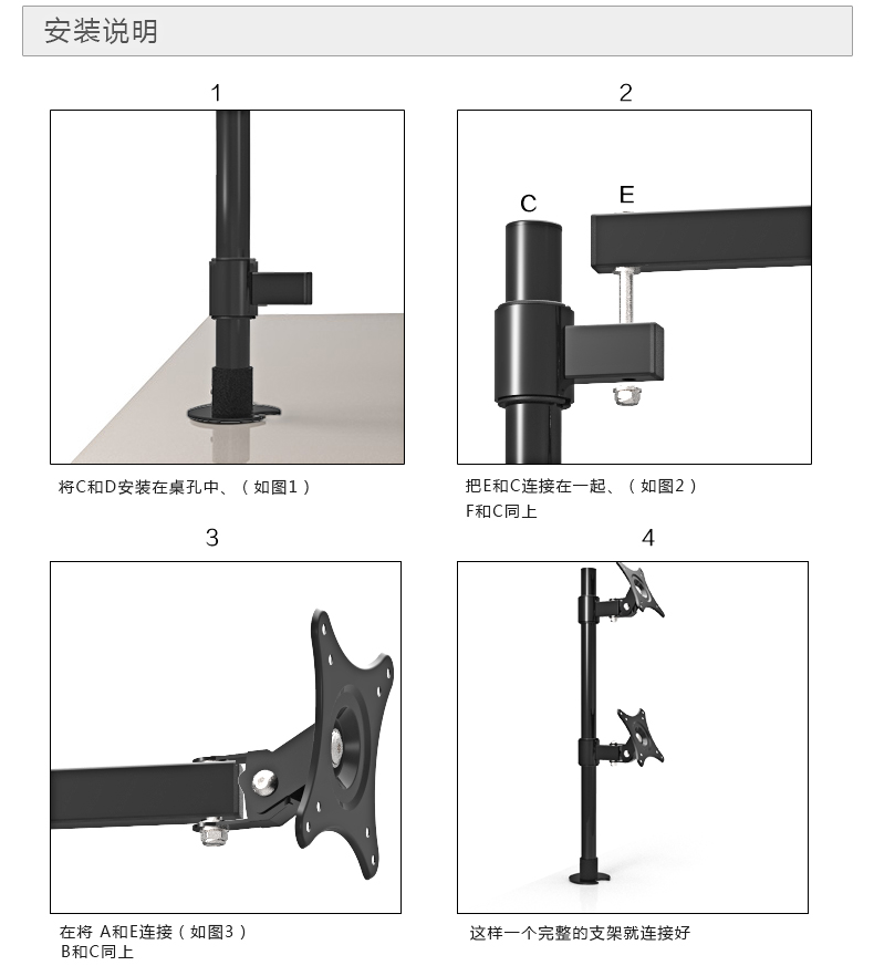 安装方式有:【桌夹】适合无孔桌面和【穿孔】适合有孔桌面此链接为桌夹安装方式。