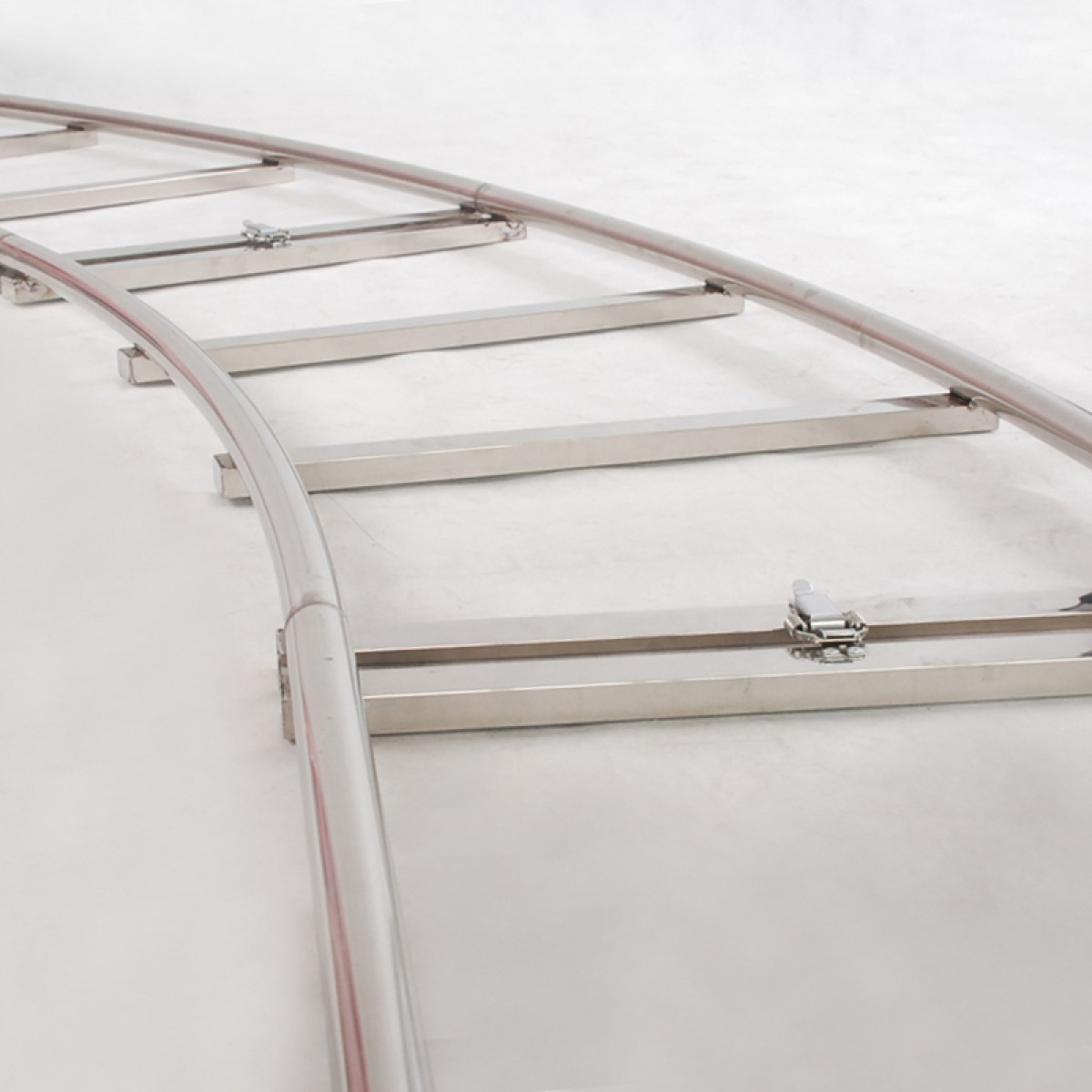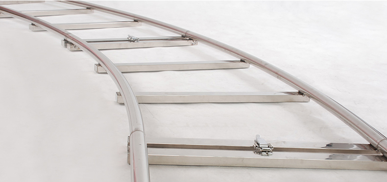 可自由组合灵活配置,将多节直轨和弯轨、起始轨等组合成一套导轨。 精密连接接口处精密连接方便(直轨 弯轨每节随意组装)每节4根横档,使轨道更结实稳定,横档封口抛光。